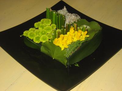 Apporter de la verdure du jardin au choix et une base plate rectangulaire ou ovale de maximum 10 sur 20 cm |