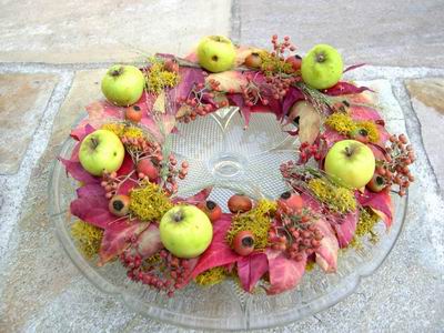 Apporter une coupelle plate, des feuilles d'automne et des verdures à baies (houx, aucuba, certain sapin, pyracantha, viburnum,...)ainsi qu'un journal |